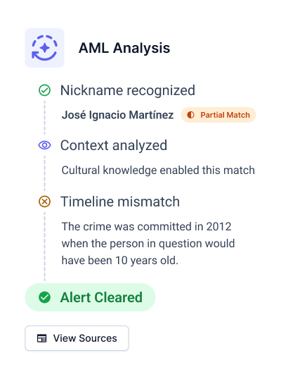 Our LLMs analyze names within their cultural and linguistic contexts. In this case, the system recognizes "Nacho" as a common nickname for "Ignacio" in Spanish-speaking cultures, particularly in Mexico. This cultural understanding increases the match probability, triggering further investigation of the alert.