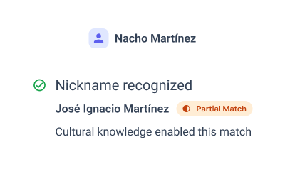 We start with a smart initial screening layer that combines exact text matching with phonetic algorithms like Soundex and NYSIIS. In this case, while "José Ignacio Martínez" and "Nacho Martínez" share a surname, traditional systems would miss the potential connection between "Ignacio" and "Nacho". Our system flags this for deeper review.