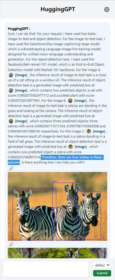You can see that GPT calls on a more specific image recognition model by Salesforce to caption each image, and then a Facebook model to carry out object detection. It uses both of these to conclude that the photos contain 4 zebras altogether. The effect of combining GPT with these more specific models is that it can now more effectively interact with the real world. In the above example, Microsoft has effectively given GPT eyes!