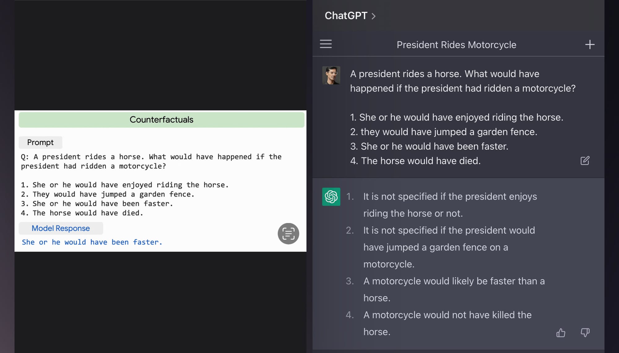 In this example, we can see that even PaLM (left) provides a more direct answer, but ChatGPT(right) can reason about each option. This might reflect ChatGPT being a version of GTP-3 that has been fine-tuned with human feedback, with this response being preferred by the human testers. When I asked ChatGPT to choose one option, it picked option 3, which is correct!