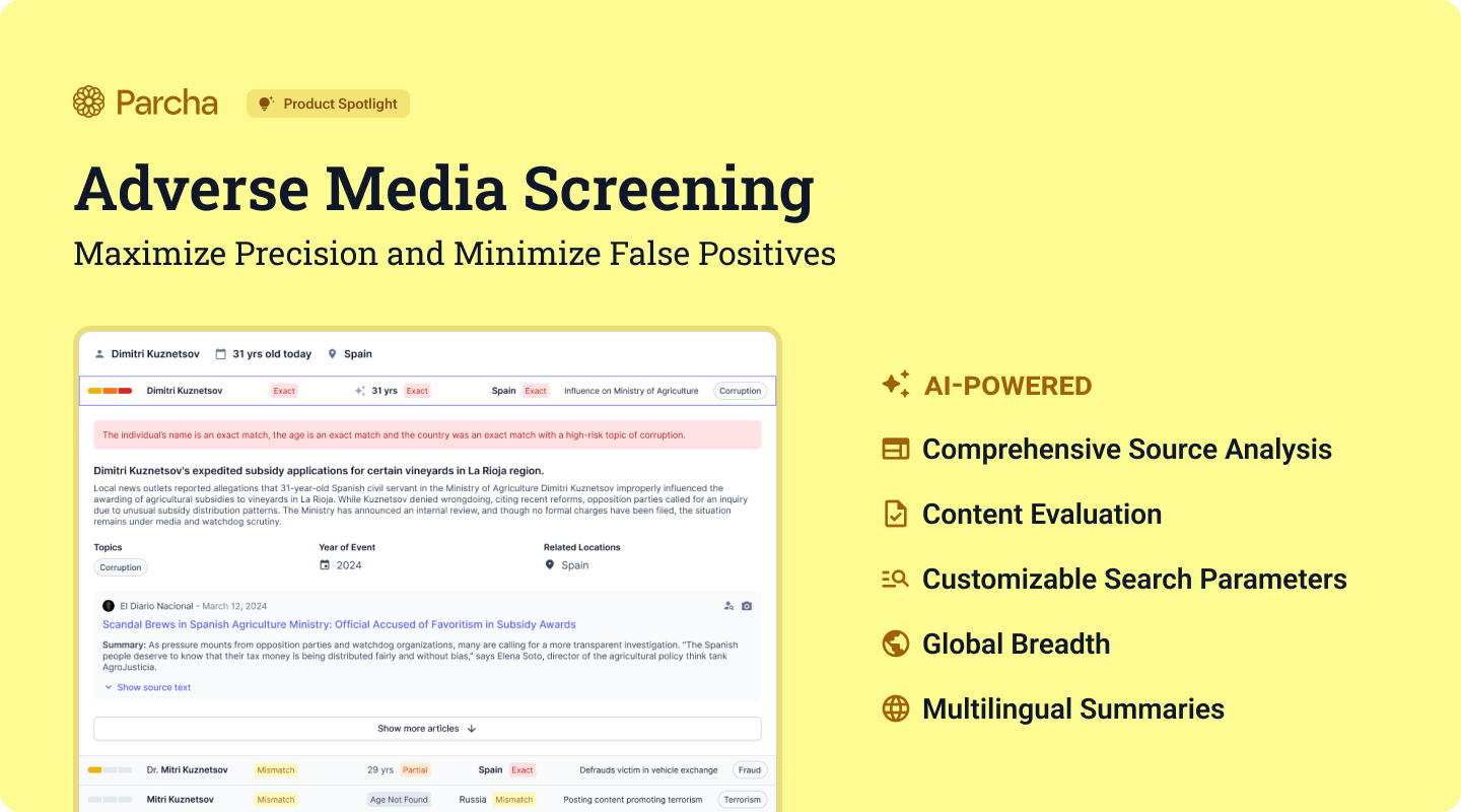 With just a website address, Parcha’s AI can scan the entirety of a business’s online presence as part of Know Your Business (KYB) onboarding. AI Compliance Reports leverage various AI models, including multi-modal ones, to build auditable SMB risk profiles. In doing so, Parcha’s team spent hundreds of engineering hours building AI pipelines to determine the relevance of data ingested across every media type, including sanctions and watchlists. This is necessary when onboarding small businesses with common names, global footprints, and complex ownership structures. Parcha does it all in minutes — not hours or days.