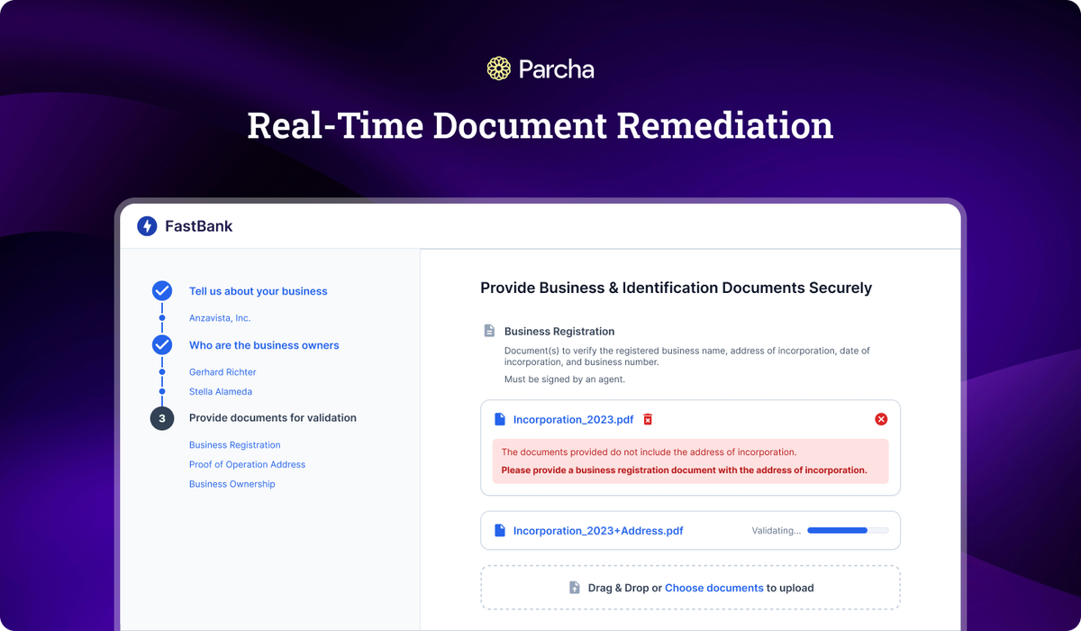 Are you tired of the back-and-forth of trying to validate business documents like registrations, licenses, and tax confirmations with customers? Our new real-time document verification process integrates with your onboarding flow via API to automatically verify documents in seconds and remediate issues directly with customers.