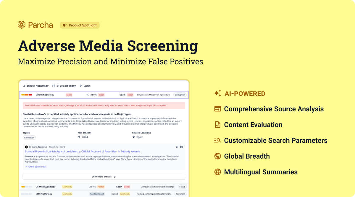At Parcha, we're building AI that helps banks and fintech onboard more customers faster with stronger compliance. In this inaugural edition of The Audit Log, we'll cover how we're laying the foundations for AI-accelerated compliance reviews with three primary use cases: due diligence, document verification, and AML screening combined with our AI model risk framework, which helps us achieve 99% accuracy in production.